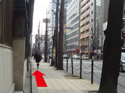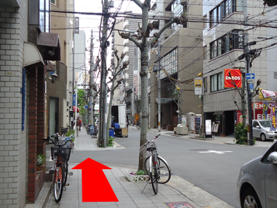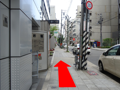 車の進行方向とは逆にまっすぐ歩道を進みます。